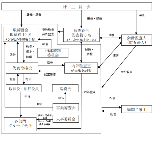 <取締役会>取締役会は10名(うち社外取締役2名)で構成されており、原則として月1回定例で取締役会を開催し、取締役10名の審議により審議事項を各取締役から説明し決議する体制をとっております。また、緊急の取締役会決議を要する重要事項については、都度臨時取締役会を招集し、個別審議により決議することとしております。