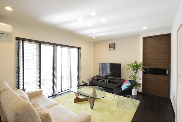 - 南側に全開口サッシを採用することで、たっぷりの採光を確保したリビングは、落ち着いた色調のフローリングとエコカラット、白のクロスによってシンプルながら上質な印象の空間にしました。日当たりと断熱性がいいため、北陸の寒い冬でもとても暖かく過ごせます。