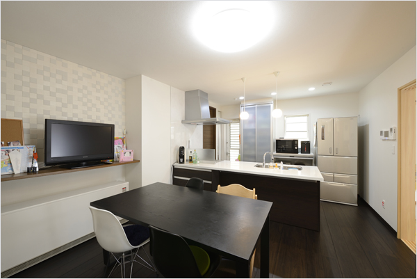 - シックな雰囲気のダイニングキッチンは、カウンター下に蓄熱暖房機を設置しました。冬でも暖かくとても便利です。