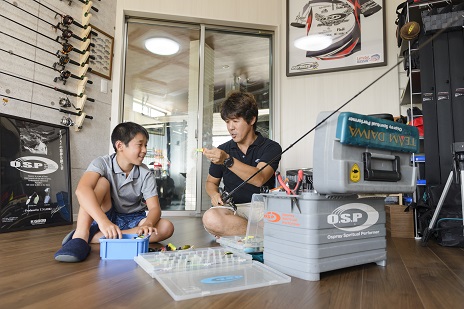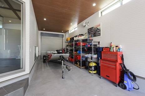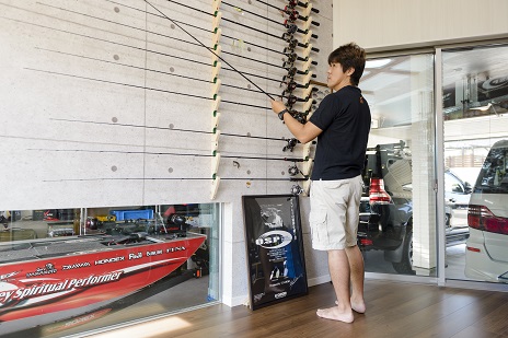 - 釣り竿や釣りの道具をしまう趣味の部屋を設置。天井を高くし、壁一面に釣り竿を上から並べて飾れるようにしました。また下の窓からは釣り用のボートを眺めることもできます。