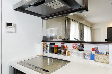 - キッチン前の立ち上がりカウンターをくり抜き、調味料置き場とコンセントの差し込み口をつくるなど使いやすさにこだわりました。