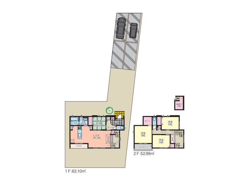 | 私道負担・道路 | 道路幅:6m、アスファルト舗装、公道、私道負担無し、2号地土地面積は路地状部分89.93㎡ |