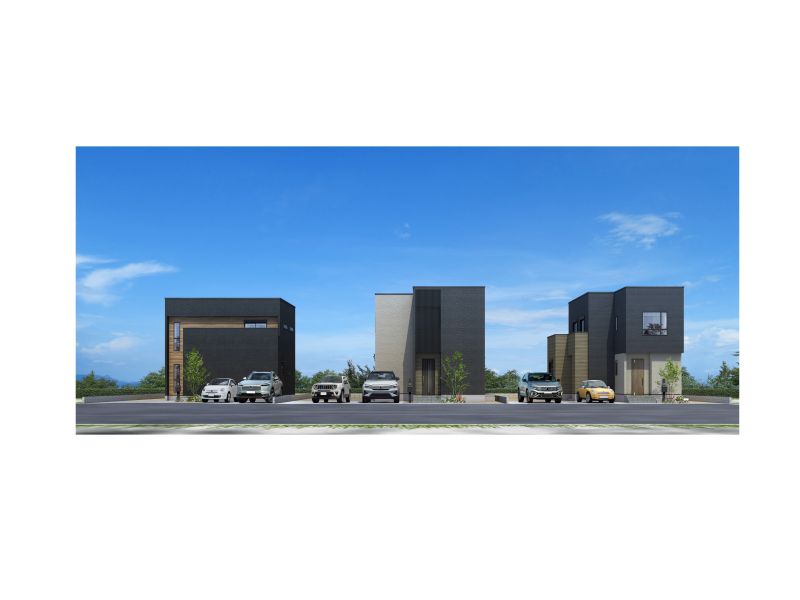 【タマタウンJR筑前深江駅東】即引渡し可!ひとつひとつ違いを持たせたモダンな外観、全6区画の分譲地、堂々完成です。建物110㎡超・並列2台駐車可能。ぜひご見学ください。
