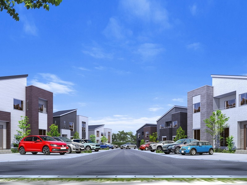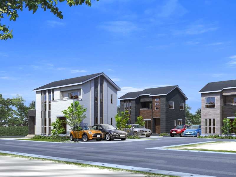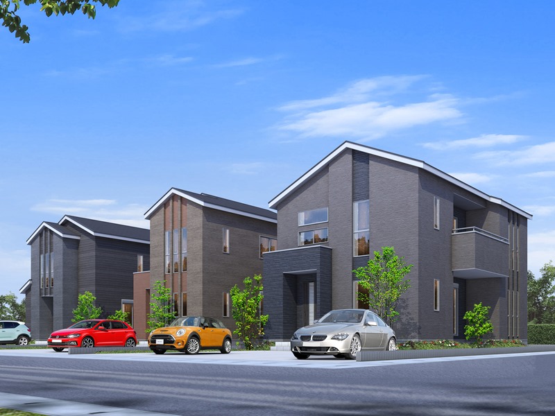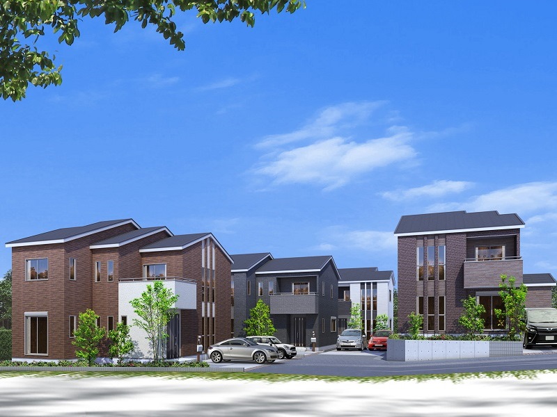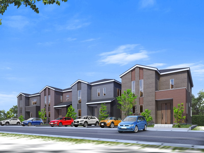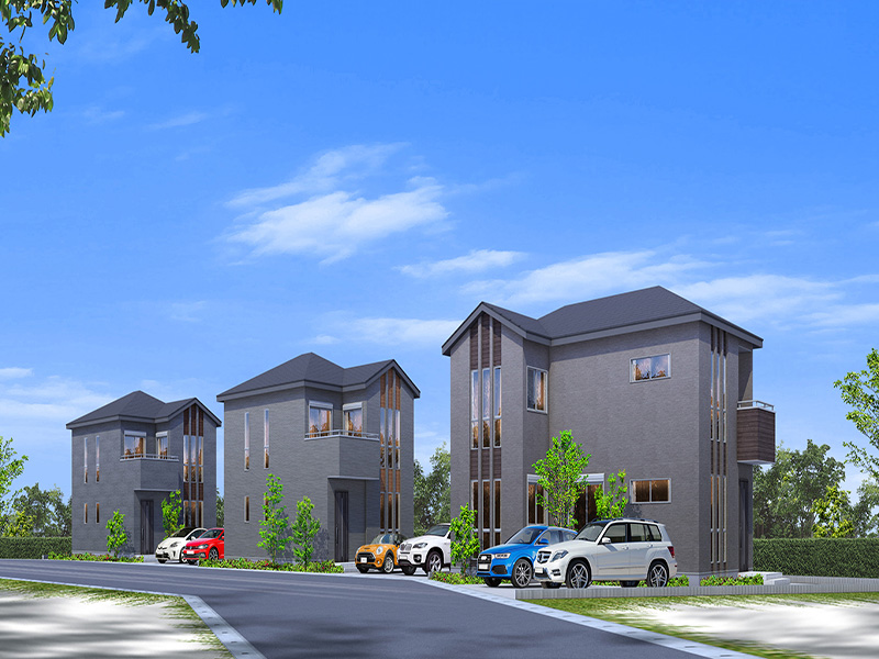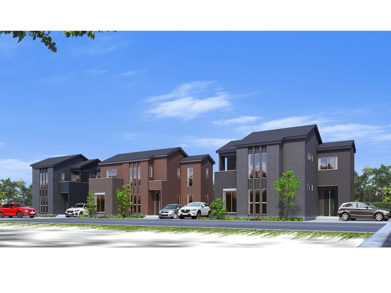 豊富な収納スペースと充実設備を備えた全5邸の高品質戸建分譲住宅の街並み。家事動線の良さと収納力が魅力の間取り。徒歩圏内に充実した周辺環境。