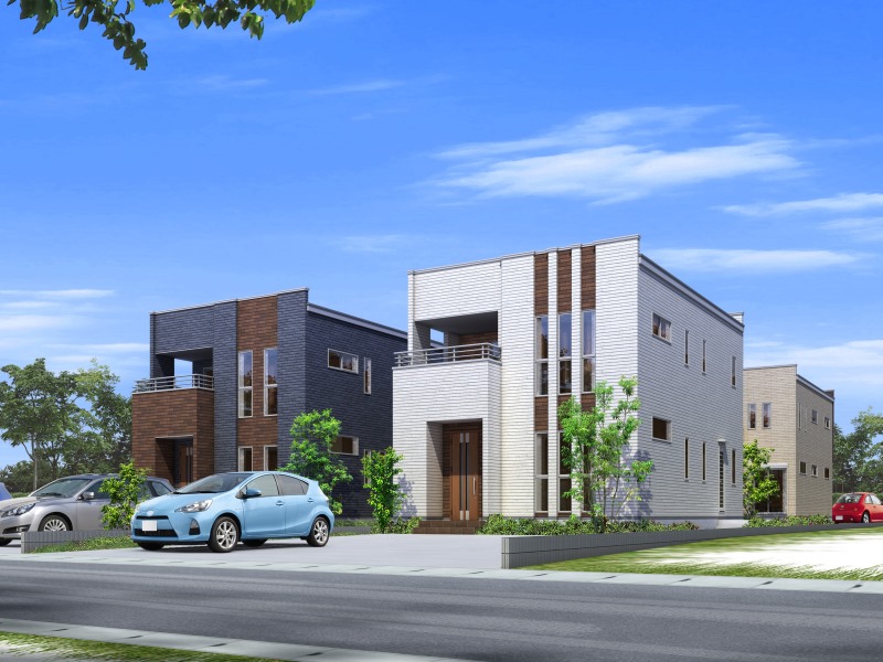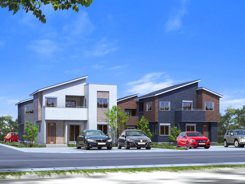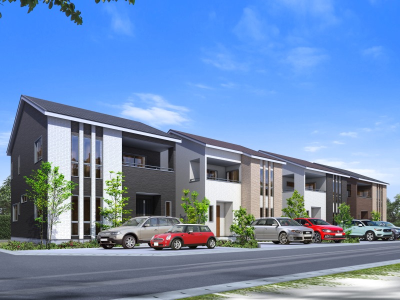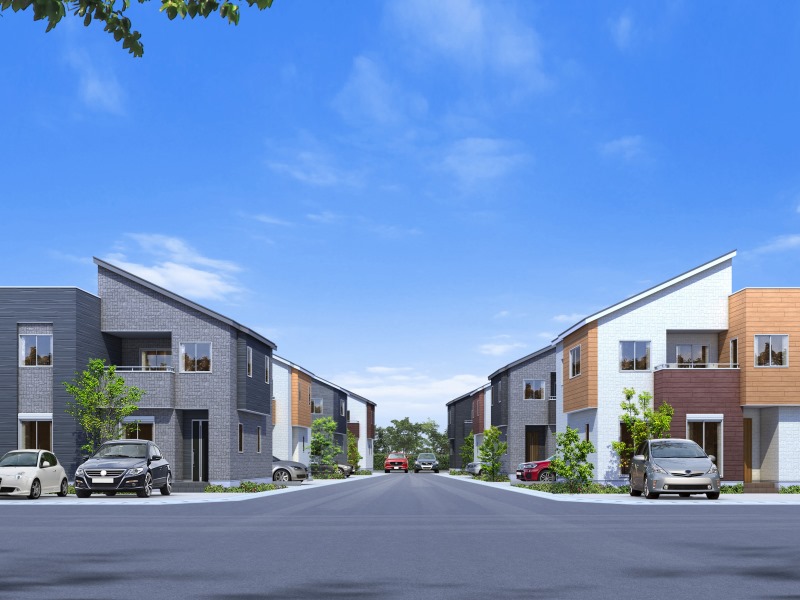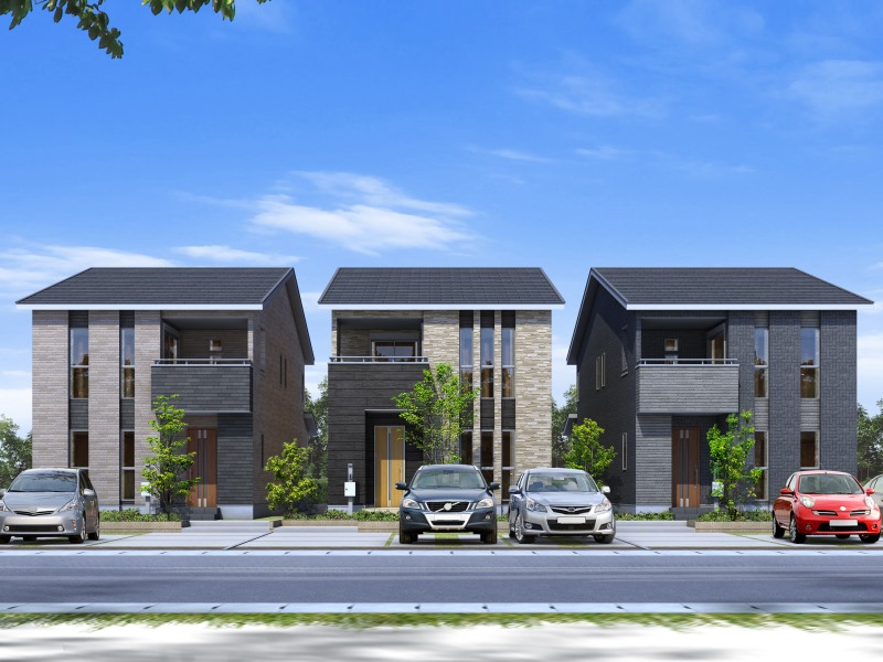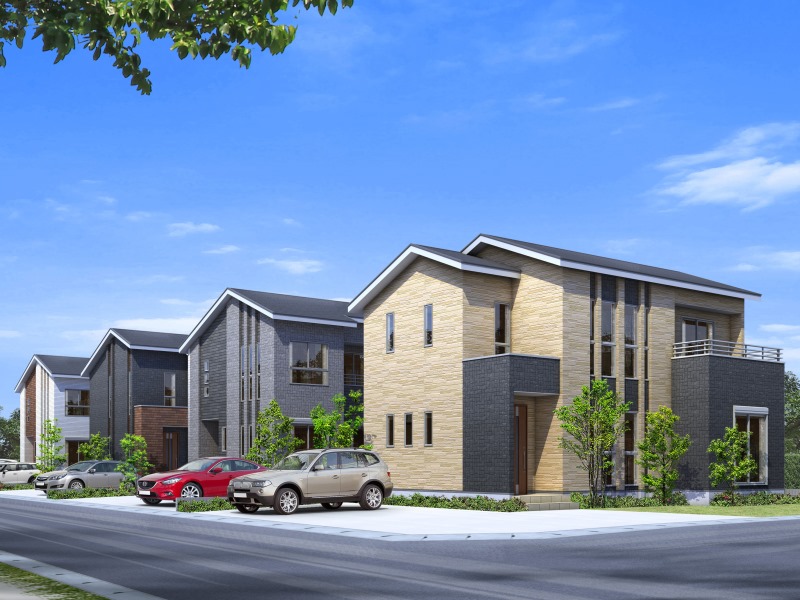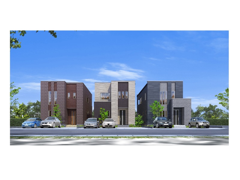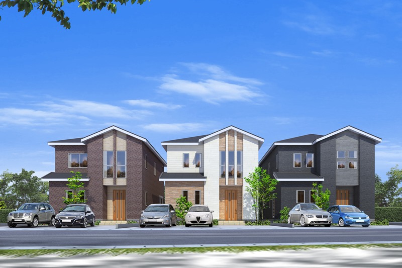 豊富な収納スペースと充実設備を備えた全5邸の高品質戸建分譲住宅の街並み。家事動線の良さと収納力が魅力の間取り。徒歩圏内に充実した周辺環境。