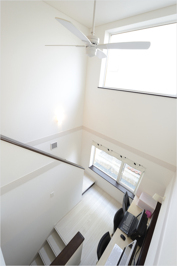 - 吹き抜けには、シーリングファンと大きな窓を設置し、通風と採光を確保しました。採光の確保やクロスを白にすることで部屋全体が明るくなり、友人からも好評です。