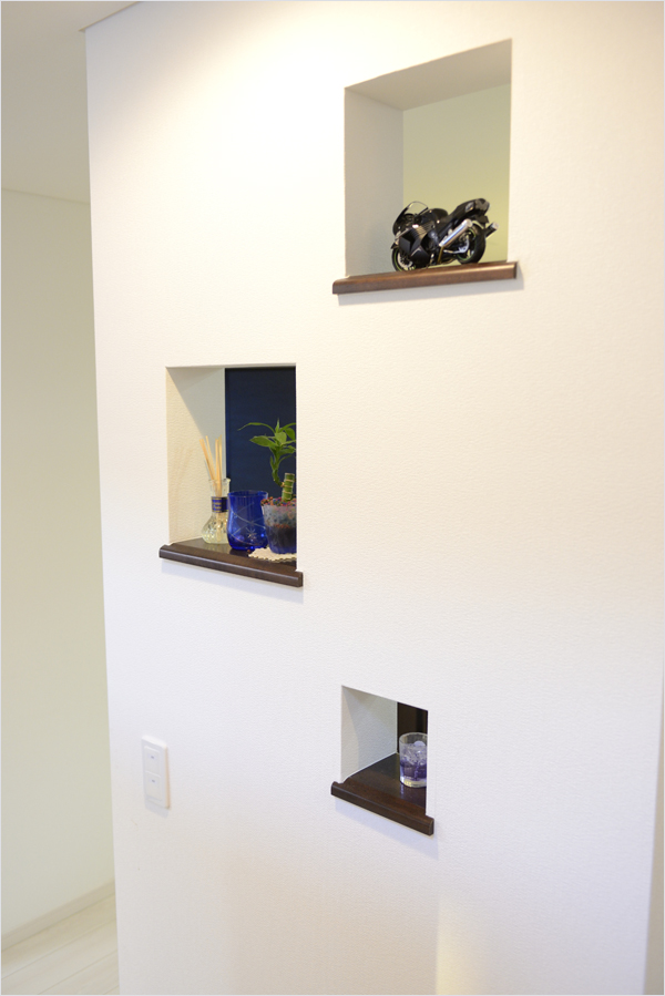 - 殺風景になりがちな廊下にニッチを設けました。場所を取らずにインテリアが楽しめ、旅先での小物選びが楽しくなりそうです。