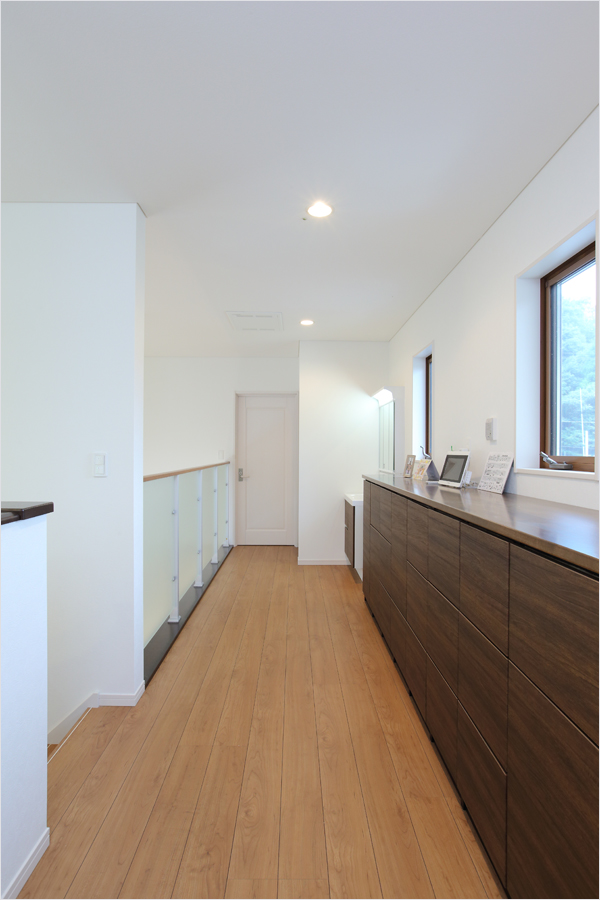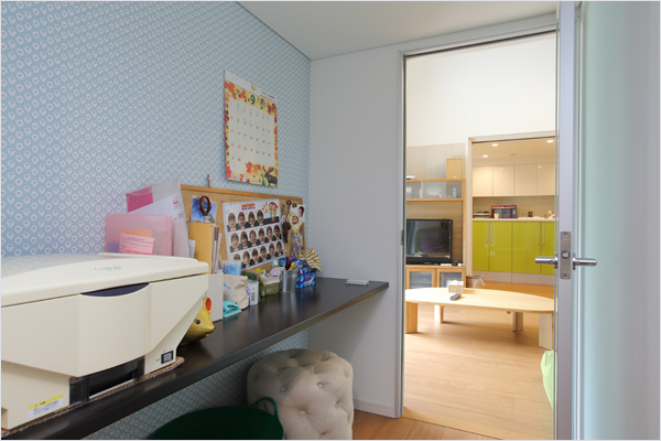 - 中2階の下に設けた家事室では、洗濯物を畳んだり、趣味を楽む、とても便利な空間になっています。