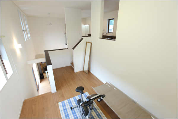 - 中2階はトレーニングスペースとして活用。将来的には読書スペースなど、家族の共有空間にする予定です。