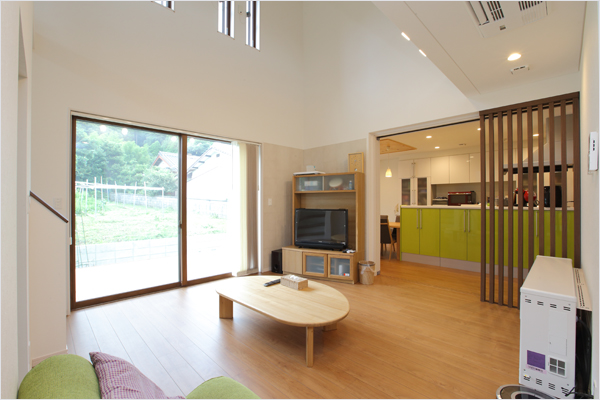 - リビングを吹き抜けにすることで圧倒的な開放感を演出しました。キッチンで家事をしていてもリビングで遊ぶ子供に目が届くので安心して料理ができます。