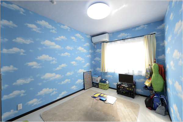 - 子供部屋には空に浮かぶ雲のクロスを採用しました。電気を消すと天井が星座の形に光りとてもきれいです。