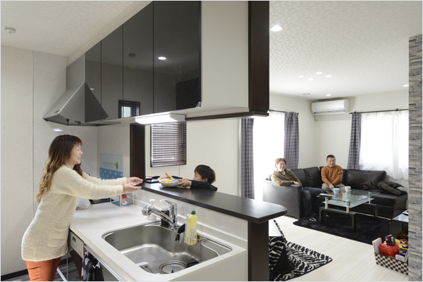 - リビングを見渡せる対面キッチンは、調理しながらでもリビングでくつろぐ家族と気軽にコミュニケーションが取れます。