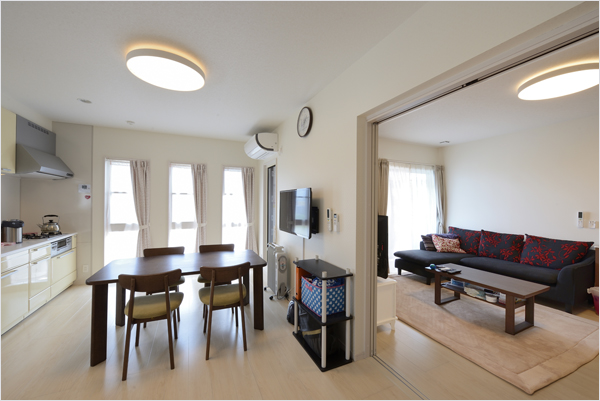 - 2階のLDKはキッチンを壁付けにすることで、外観のアクセントにもなっている3連窓から光が差し込み気持ちの良い空間になりました。