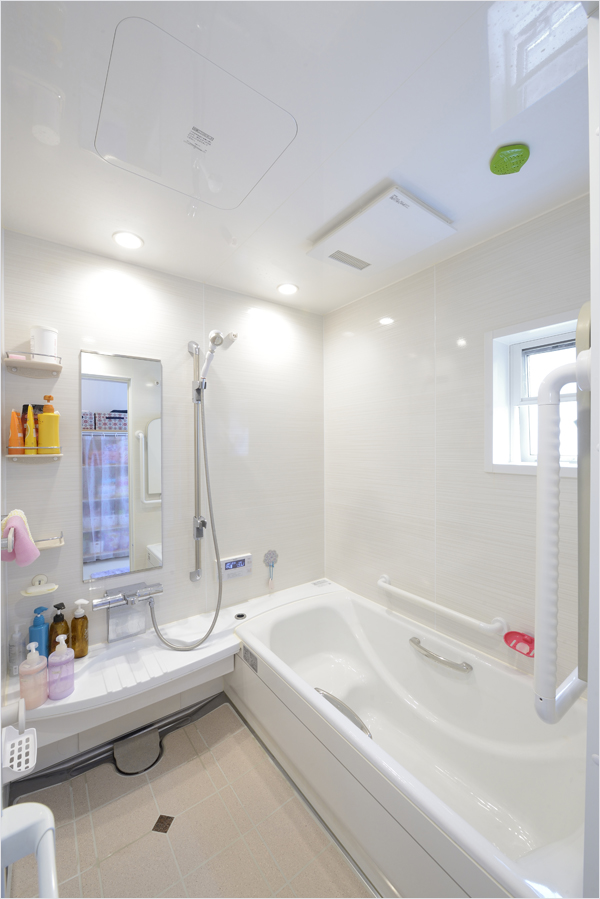 - 浴室は、白で統一して清潔感のある空間にしました。浴槽は陶器製のものを設置したことで冬でもお湯が冷めにくく、とても快適です。