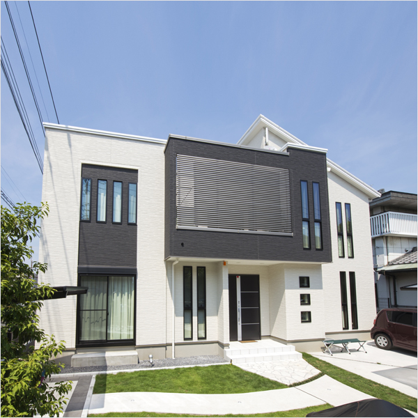 色使いやデザインがスタイリッシュで美しい外観は、ルーバーの奥が広々としたバルコニーになっており、アウトドアリビングとして使用しています。 キッチン横には、荷物を一時保管できる納戸を設置したり、洗面には、時間が重なった時にも便利なようにダブルボウルを設置したりと要望が叶い、とても快適に過ごせる家です。
