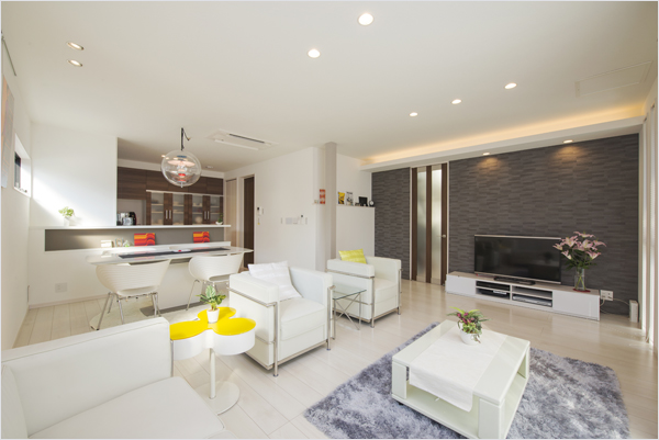 - ゆったりとくつろげる約23帖の広さがあるLDKは、テレビ背面のエコカラットやコーブ照明がアクセントになっています。キッチンは2人立ってもゆとりのある広さを確保しています。