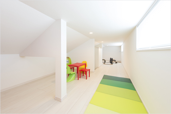 - 2階の読書スペースは、読書や子供たちが勉強をするのにとても便利です。また、吹き抜けの近くにあるので1階にいる家族とコミュニケーションが取りやすくなっているのもこだわりの一つ。
