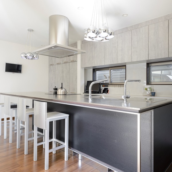 - 一目ぼれしたアイランドキッチンは、長さ3m64cmのものをオーダーし、冬に鍋を囲めるように配置しました。カップボードは、家のテーマでもある「石」と合うような色味を選んだのもこだわりの一つです。