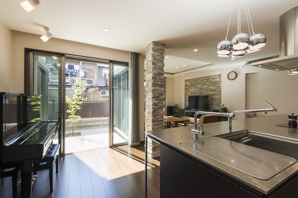 - リビングは、テレビの背面と構造柱に石材を張ることで、彩り豊かな空間を演出しました。また、大きなテラスをリビング隣に配置することで、開放的な空間を実現しました。