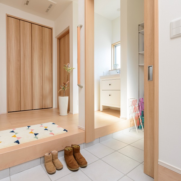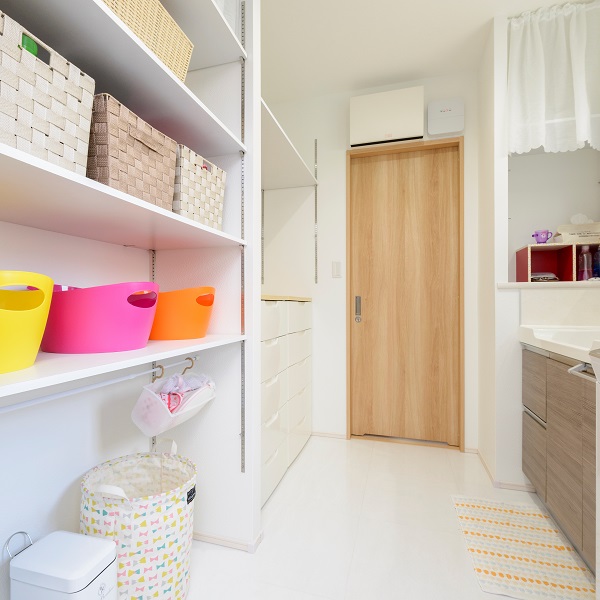 - 洗面脱衣室は、将来の同居を考慮し、収納スペースを広めに確保しました。