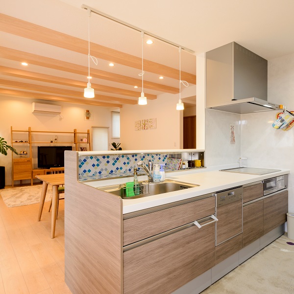 - 吊戸棚のないオープンキッチンは、リビングで遊んでいる子供が視野に入るので、安心して料理ができます。また、カウンターの立ち上がり部分には、調味料なども収納することができるので、とても便利です。