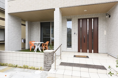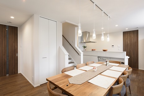 外観は、外壁を総タイル貼りにすることで、高級感を演出しました。屋根には、リースの太陽光発電システムを搭載し、光熱費削減に役立てています。 室内は、リビングに大きな吹き抜けを設けて開放的な空間を演出しました。またキッチンを中心にリビング、階段、洗面室や浴室、勝手口などを近くに配置して効率的な動線も実現しました。
