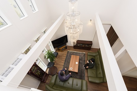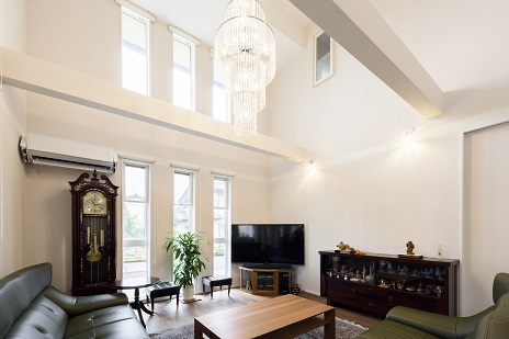 - オーダーメイドのシャンデリアが空間を華やかにしてくれるリビングは、カリモクのソファーやペルシャ絨毯、開放感のある吹き抜けなど、数々のこだわりを叶え、居心地の良い空間を実現しました。