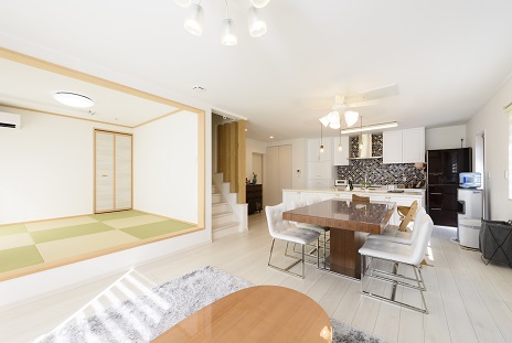 - 汚れに気が付いていつもきれいにしたいという考えから白を基調にした明るいLDK。和室は段差を設けて空間を視覚的に分けました。