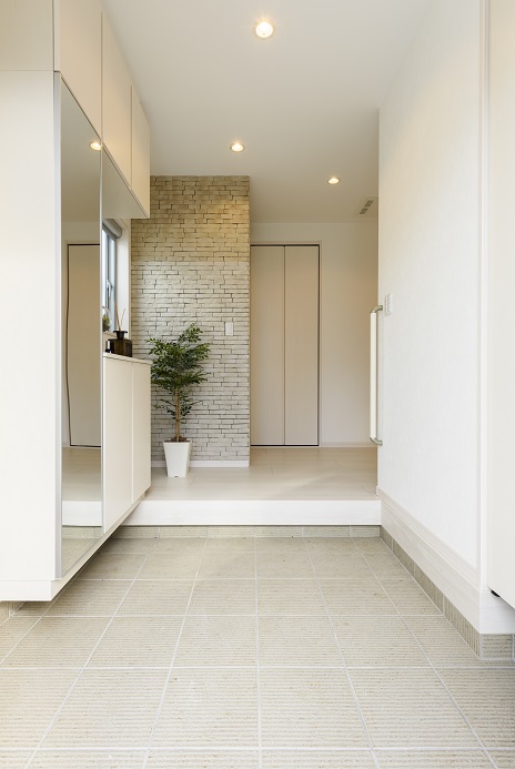 - アクセントにエコカラットを配置した玄関は、正面に収納を設けました。
