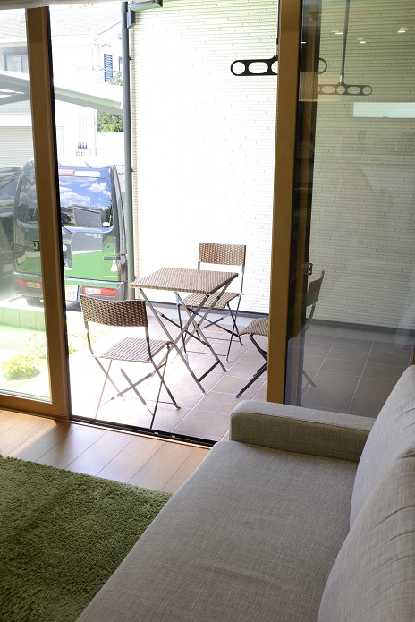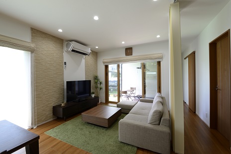- テラスからの光も入り、明るく気持ちよく過ごせるリビング。テレビ背面の壁 (エアコンの両側)にはエコカラットを使用することで、インテリアのアクセントになっている。