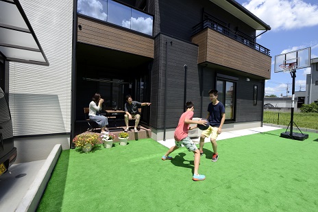 - 人工芝の庭は、バスケットボールの練習が思う存分にできるスペースです。