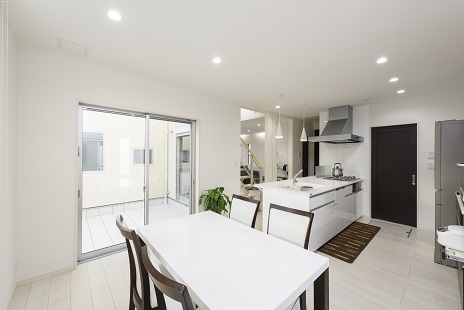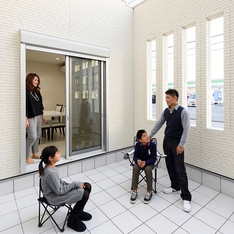 - 中庭からも光と風が入り込む明るいリビング。階段は、軽やかで美しいスケルトンタイプにすることで光を遮らず、明るい空間を演出しています。