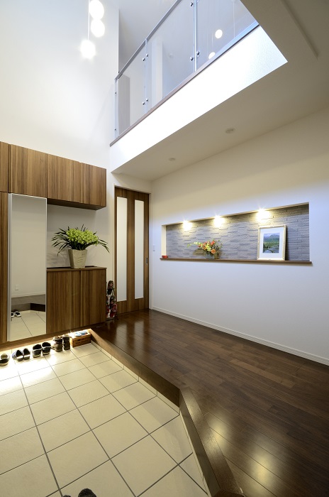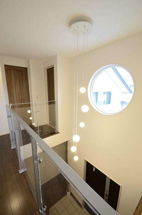 大きな丸窓と玄関を目隠しする格子が印象的なモダンな外観にしました。リビングや玄関を吹き抜けにしたり、収納スペースを多く設けたりと快適に暮らすためのこだわりが実現できました。また断熱性や遮音性等の住宅性能も優れており、とても住みやすい100点満点の家です。