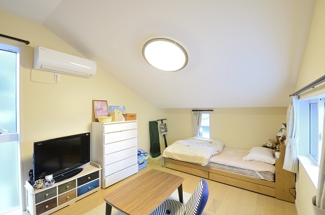 - 壁紙が温かみある色合いの部屋は、勾配天井が海外の屋根裏部屋のような雰囲気でお気に入りの空間です。