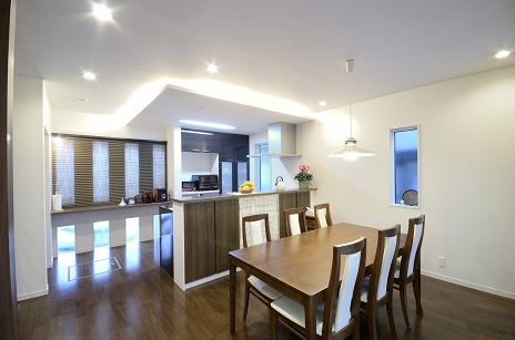 - 下がり天井に間接照明を埋め込み、シックな雰囲気でまとめた美しいキッチンは、吊戸棚をなくして空間に広がりを出したほか、ゆとりの広さを確保して使いやすさにも配慮しました。