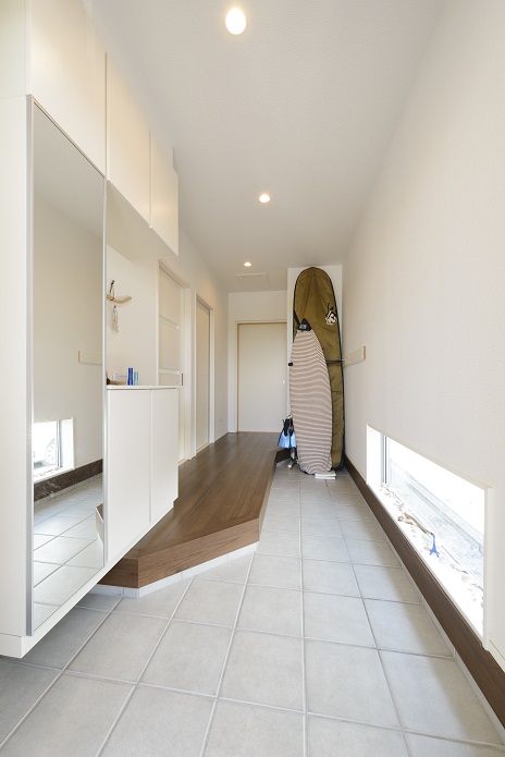 ゆったりとした風景の中にひときわ映えるシンプルなデザインの平屋にしました。広いウッドデッキでは家族でバーベキューを楽しんでいます。リビングに設置した薪ストーブ、サーフボードが置ける玄関土間、主寝室には小上がりの畳スペースなど、数々の希望が実現してとても居心地の良い家になりました。