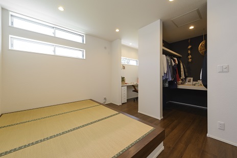 - ウォークインクローゼットや夫婦で使うワークスペースを設けた主寝室は、小上がりの畳スペースを設置し、くつろげる空間にしました。