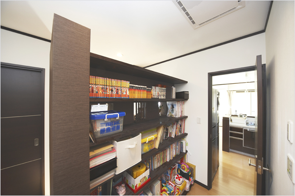 - 本棚の一番下を娘のスペースにしたら、よくそこで遊ぶようになりました。キッチンの側なので近くにいてくれて嬉しいです。家族の距離が近くなった感じがします。