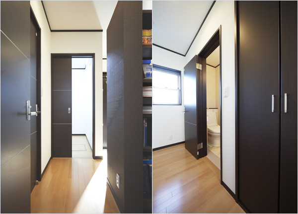 - 玄関ドアを開けた時に、来る人にいい感じの印象を持っていただきたい。そんな思いで玄関ホールはデザインしました。正面の壁にはアクセントカラーを効かせて、四角い小窓風の飾り棚をもうけました。