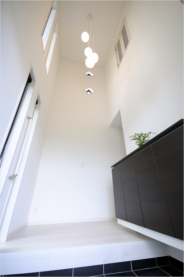 - 玄関も吹き抜けにしてシャンデリアを設置することにより明るい空間になりました。友人からも好評です。