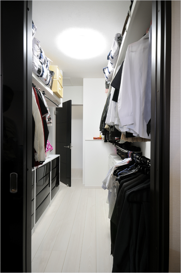 - 主寝室からも廊下からも出入りできるウォークインクローゼットを設置し、より多くの衣類を収納できるようにしてあります。