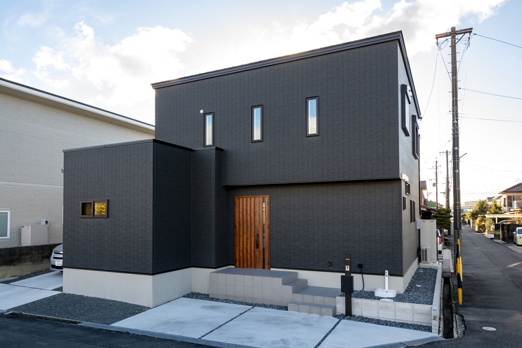 ボックスを組み合わせたようなデザインが目を引く、落ち着きと上質感を兼ね備えたスタイリッシュな外観。駐車スペースも5台分確保しました