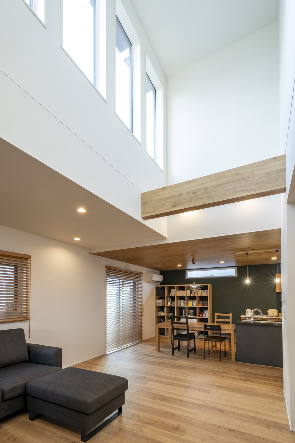吹抜けに設けた高窓からの光が降り注ぐリビング。木の質感と融合することで、ゆったりとした時間を優雅に、そして快適に過ごせる空間です