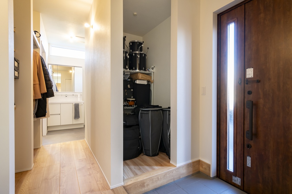 玄関横の収納には、ご主人の仕事道具であるドラムセットを収納。洗面室への動線上に、外出時や帰宅時に便利なコート掛けを設置しました