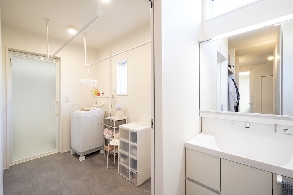 洗濯物干しに便利なアイアンバーを2本設けた脱衣室。床はフロアタイルにすることで、汚れが目立ちにくく、お手入れのしやすさにも配慮しています