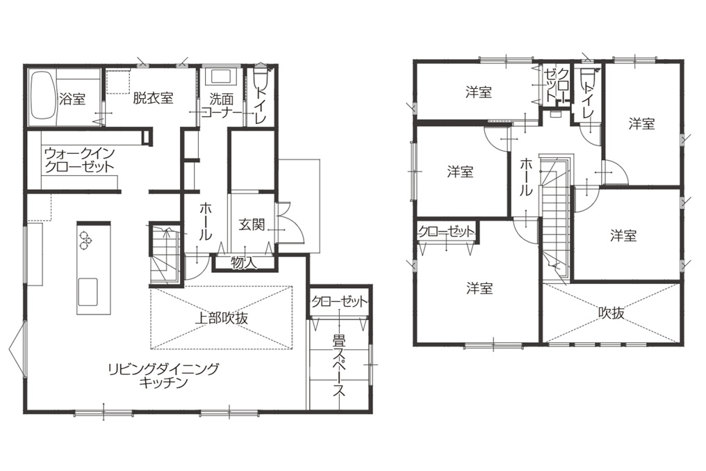 木の質感を生かした「和風モダン」の意匠が、訪れる人を優しく迎え入れるS様邸。吹抜けからやわらかな陽射しが注ぐ開放的なリビングは、家族が自然と集まる心地よい空間です。音楽関係のお仕事に携わるご主人のために、玄関横には楽器をスムーズに搬入できる専用収納を完備。また、奥様のこだわりである効率的な家事動線の実現など、デザイン性と機能性を高次元で両立しました。日々の何気ない時間が愛おしくなる住まいです。