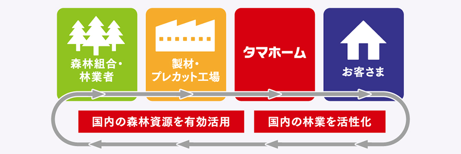 日本の国土の3分の2を森林が占め、豊富な資源があるにもかかわらず、国産材はあまり活用されていませんでした。国産材が活用されないと森林は手つかずになり荒廃し、そのまま放置すると土砂崩れなどの自然災害が発生します。それだけでなく、二酸化炭素の吸収率が低下し地球温暖化防止の機能を失います。持続的に多量の国産材を使用するためには、従来の流通形態では困難なため、タマホームでは独自の流通システム「タマストラクチャー」を構築しました。タマホームの家は国産材使用率が約74.1%(※)であり、継続的に多量の国産材を使用することが可能となりました。また「タマストラクチャー」によって、タマホームが山林と直接つながりを持ったことで、お客様を対象にした伐採や植林の体験ツアーを開催できるようになりました。同ツアーは、ご参加のお客様に、環境に対して関心を持って頂くきっかけとなっています。継続的に国産材を使用することで、今ある資源が活用できるだけでなく、森林が整備されることによって環境が保全され、新たな未来の資源が生まれます。タマホームは次世代に引き継ぐことができる持続可能な資源であり財産である森林を維持することで、地球温暖化防止・循環型社会の形成に貢献していきます。