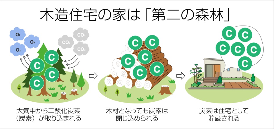 森林の樹木は光合成により、大気中の二酸化炭素(CO₂)を吸収して成長します。光合成で吸収した二酸化炭素(CO₂)を、炭素(C)として取り込み、樹木の中に炭素(C)が貯蔵されるようになります。さらに、樹木が伐採されて、木材として使用されている間も炭素(C)は貯蔵されたままとなり、大気中から吸収した二酸化炭素(CO₂)は、燃やさない限り木材から、大気中に放出されることはありません。木造住宅は、森林と同じように二酸化炭素(CO₂)を固定したままなので、「第二の森林」などと言われております。更に国産材は、輸入材と比べ、輸送時の燃料消費エネルギーが少ないことから、温室効果ガス排出量の削減につながります。