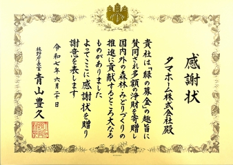 ※緑の募金:国土緑化推進機構によって、国内外の様々な、森づくり(森林整備、緑化推進等)・人づくり(森づくりリーダー育成、子どもたちへの環境教育等)に活用されています。2015年より年に2回ずつ寄付を行っており、2016年10月、2019年7月には林野庁長官より感謝状を授与されました。タマホームは今後も、お客様や株主の皆様とともに、国産材の家づくりを通じて、森林環境や地域社会への貢献に取り組んでいきます。