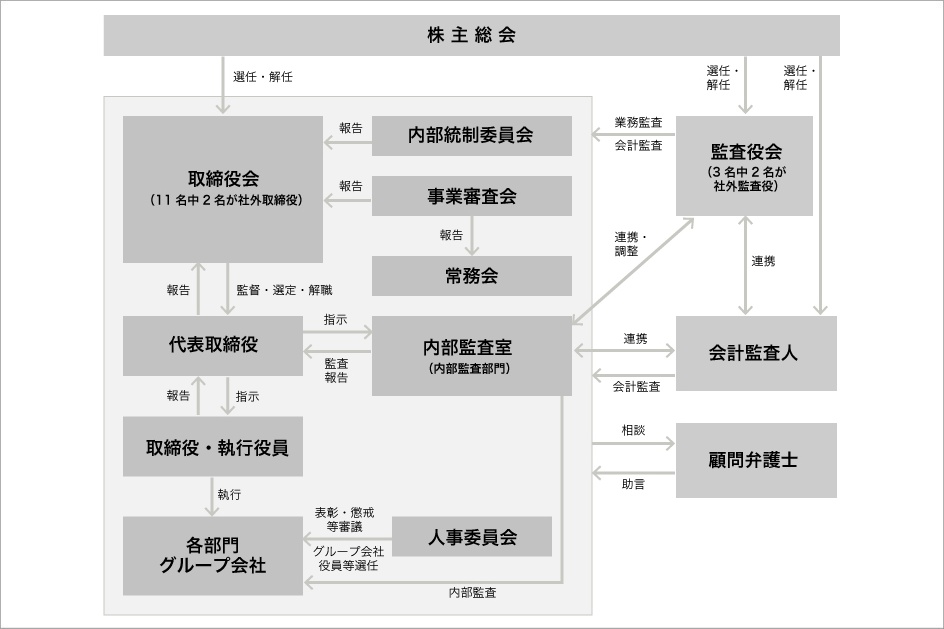 (2)執行役員制度により、取締役が経営上の判断業務に専念できる体制とし、取締役の職務執行の効率性を確保するとともに、経営環境の変化に迅速に対応した意思決定を行う。